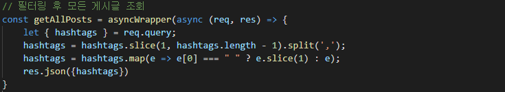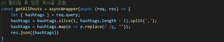 : req.query로 받아온 hashtags에서 양쪽 대괄호를 날리고(문자열이니까) ' , ' 쉼표를 기준으로 나눠서 배열로 만들어주기
