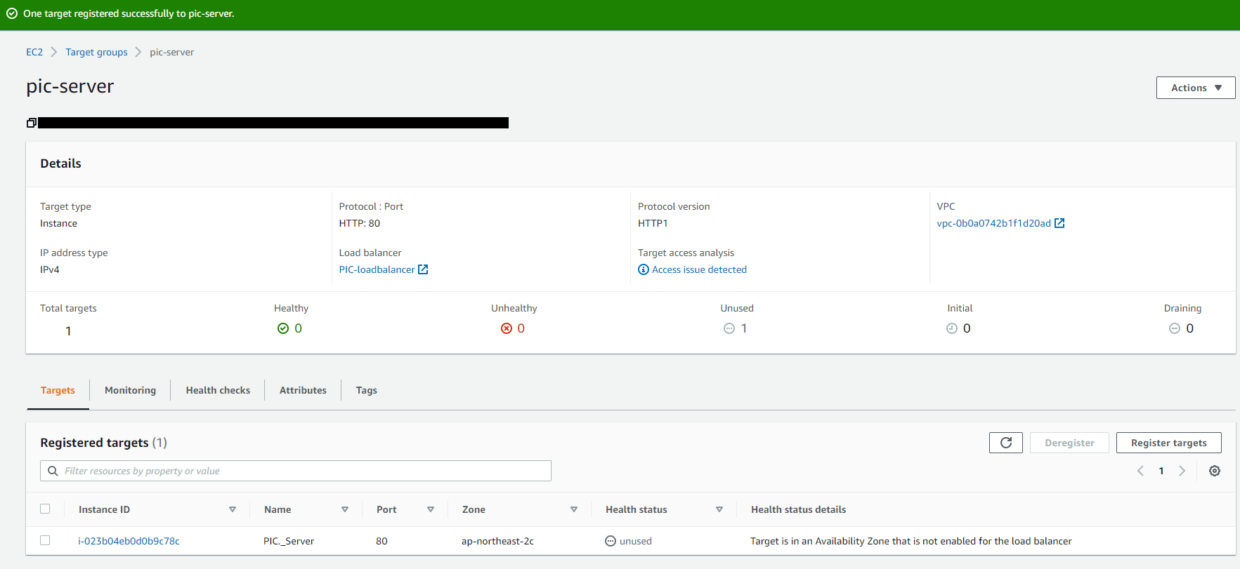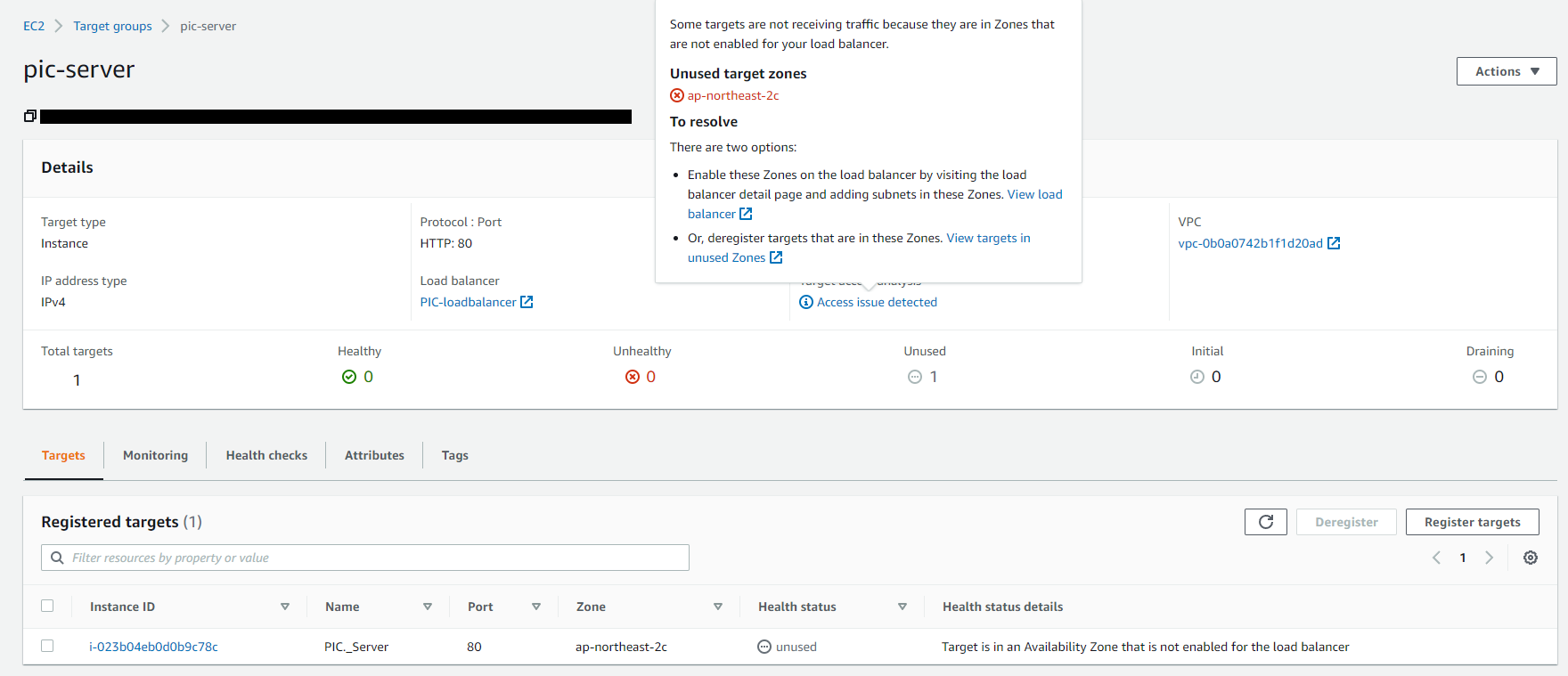 내 추측으로 생각하지 말고, 에러 코드를 따라가면서 해결해보자고 생각해서 Unused메시지가 나타난 로드밸런서의 대상그룹으로 이동해 확인해보았다.