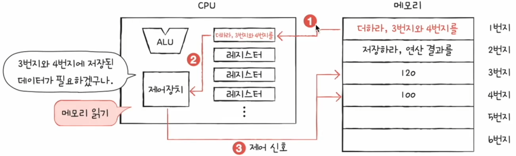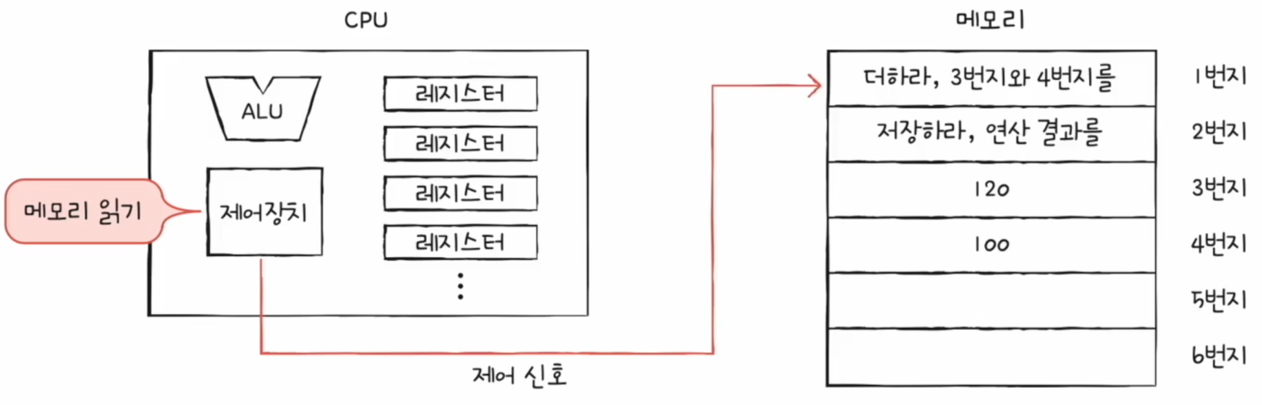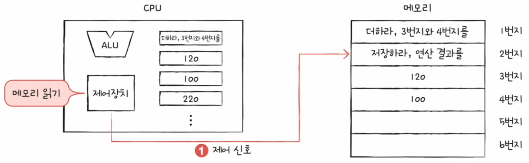 - CPU가 메모리에 저장된 값을 읽고 싶을 땐 메모리를 향해 메모리 읽기라는 제어 신호를 보냅니다.