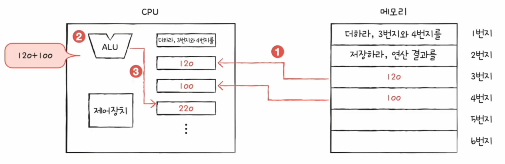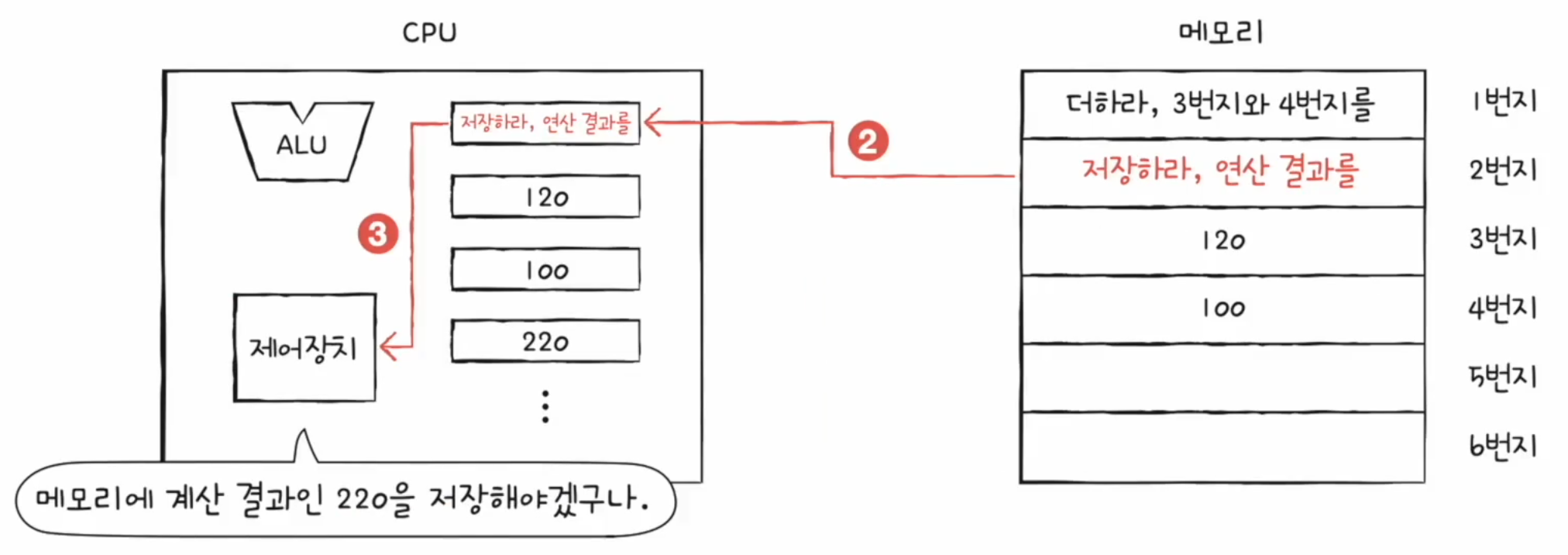 - 레지스터 : CPU 내부의 작은 저장장치+. 제어 신호 : 컴퓨터 부품들을 관리하고 작동시키기 위한 전기 신호(입출력장치 쓰기 신호, 메모리 읽기 신호 등 다양한 종류)