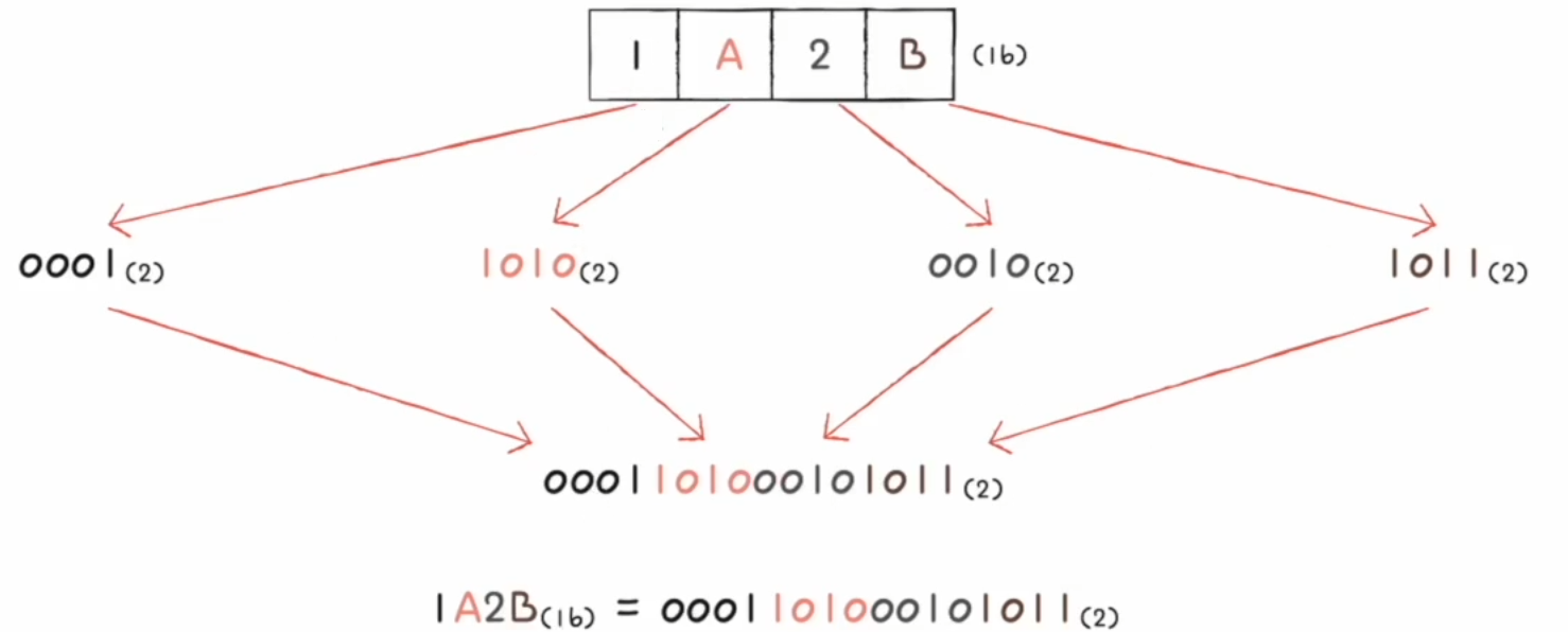 16은 2의 4승이기 때문에 4비트씩 끊어서 변환