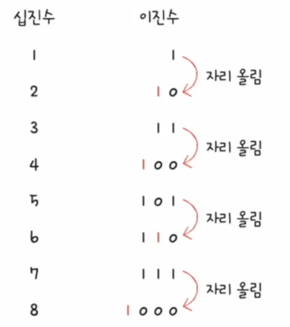이진법(binary)은 1을 넘어가는 시점에 자리올림하여 0과 1만으로 모든 수를 표현하는 방법