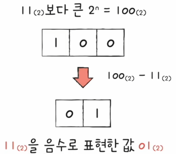 2의 보수란 어떤 수를 그보다 큰 2ⁿ 에서 뺀 값 : 모든 0과 1을 뒤집고 1 더한 값
