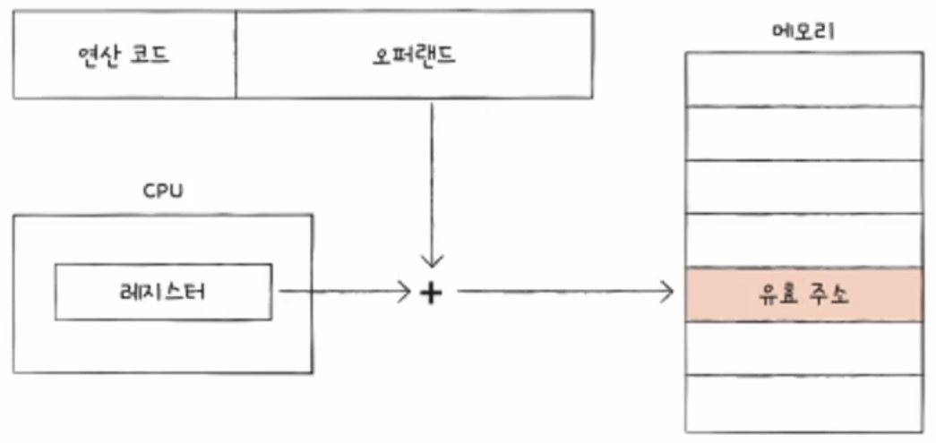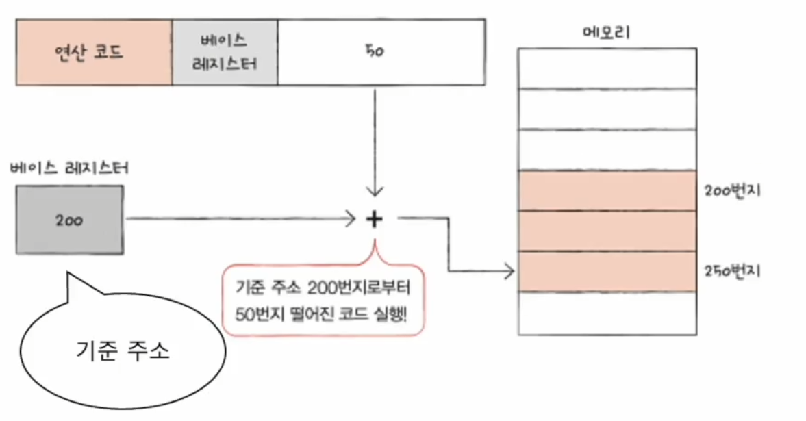2. 베이스 레지스터 주소 지정 방식 : 오퍼랜드 필드의 값과 베이스 레지스터의 값을 더해 유효 주소 얻기