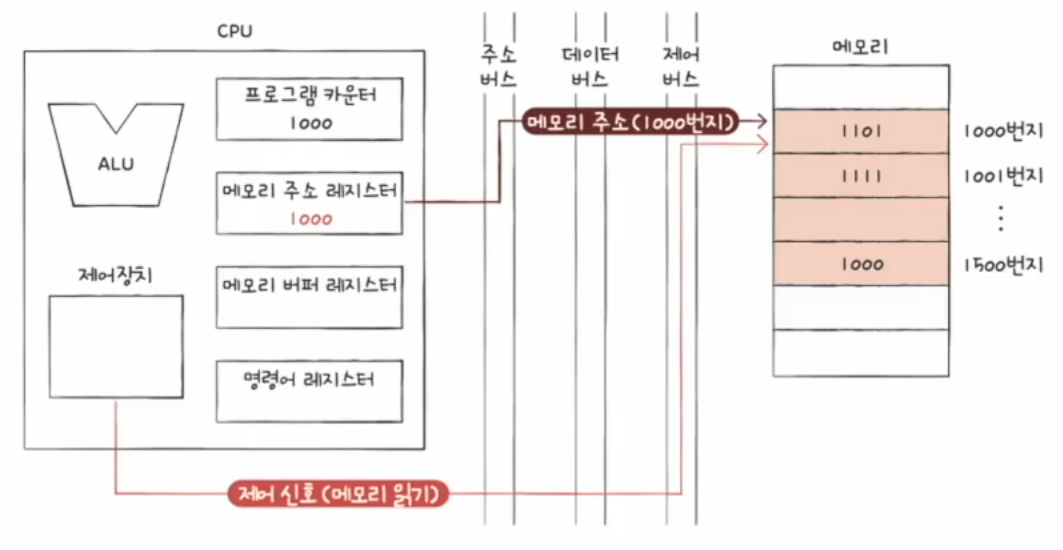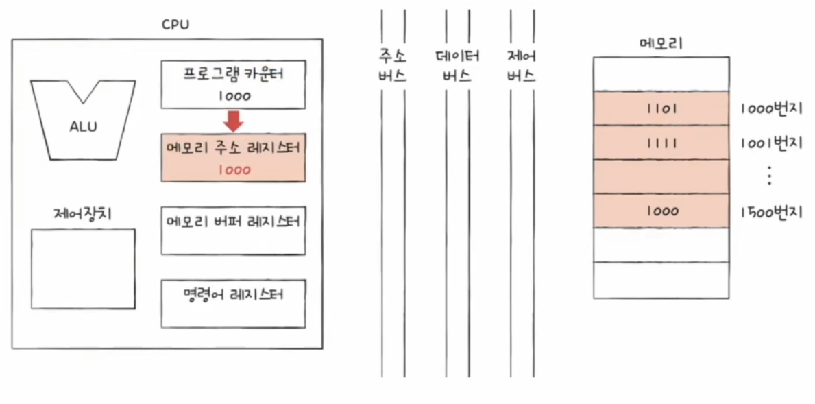 1. 프로그램 카운터에 다음으로 실행할 명령어의 주소(여기서는 1000번지)가 저장됩니다.