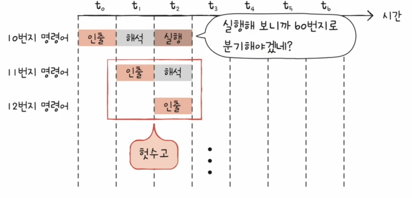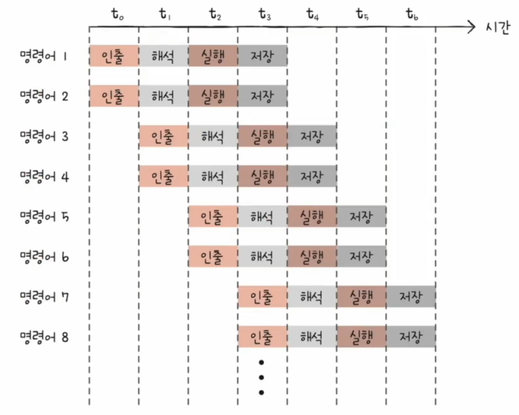 명령어 파이프라인 : 명령어 실행 단계 중 같은 단계가 겹치지만 않는다면 CPU는 각 단계를 동시에 실행할 수 있습니다.