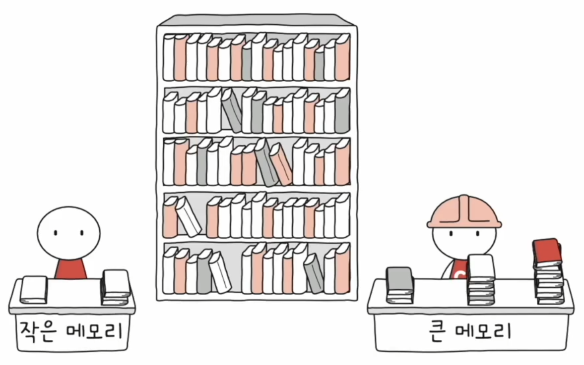 DRAM SRAM 재충전 필요함 필요 없음 속도 느림 빠름 가격 저렴함 비쌈 집적도 높은 낮음 소비 전력 적음 높음 사용 용도 주기억장치(RAM) 캐시 메모리