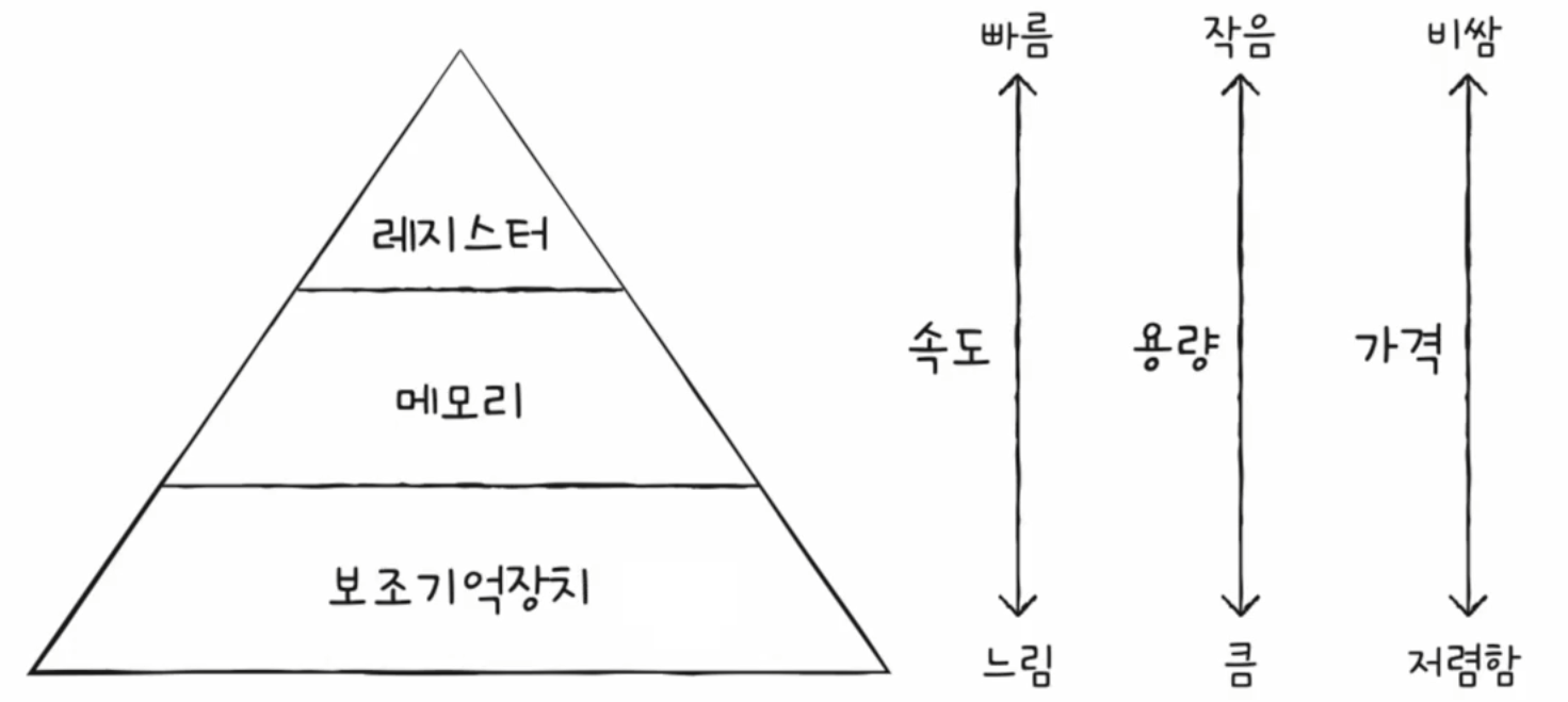 - 속도가 빠른 저장 장치는 저장 용량이 작고, 가격이 비싸다.