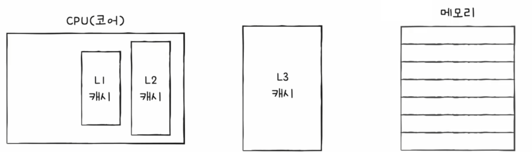 L1 - L2 - L3 캐시 +. 일반적으로 L1 캐시와 L2 캐시는 코어 내부에, L3 캐시는 코어 외부에 위치해 있습니다. (속도는 L1 > L2 > L3 순서)
