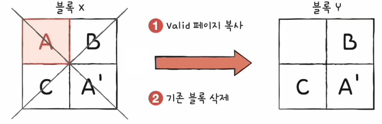 가비지 컬렉션 과정 - 유효한 페이지들만을 새로운 블록으로 복사
