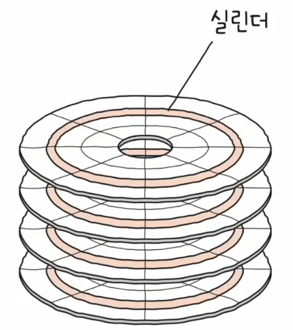 섹터(sector)가 모여 트랙(track)이 되고, 트랙이 모여 실린더(cylinder)가 됩니다.