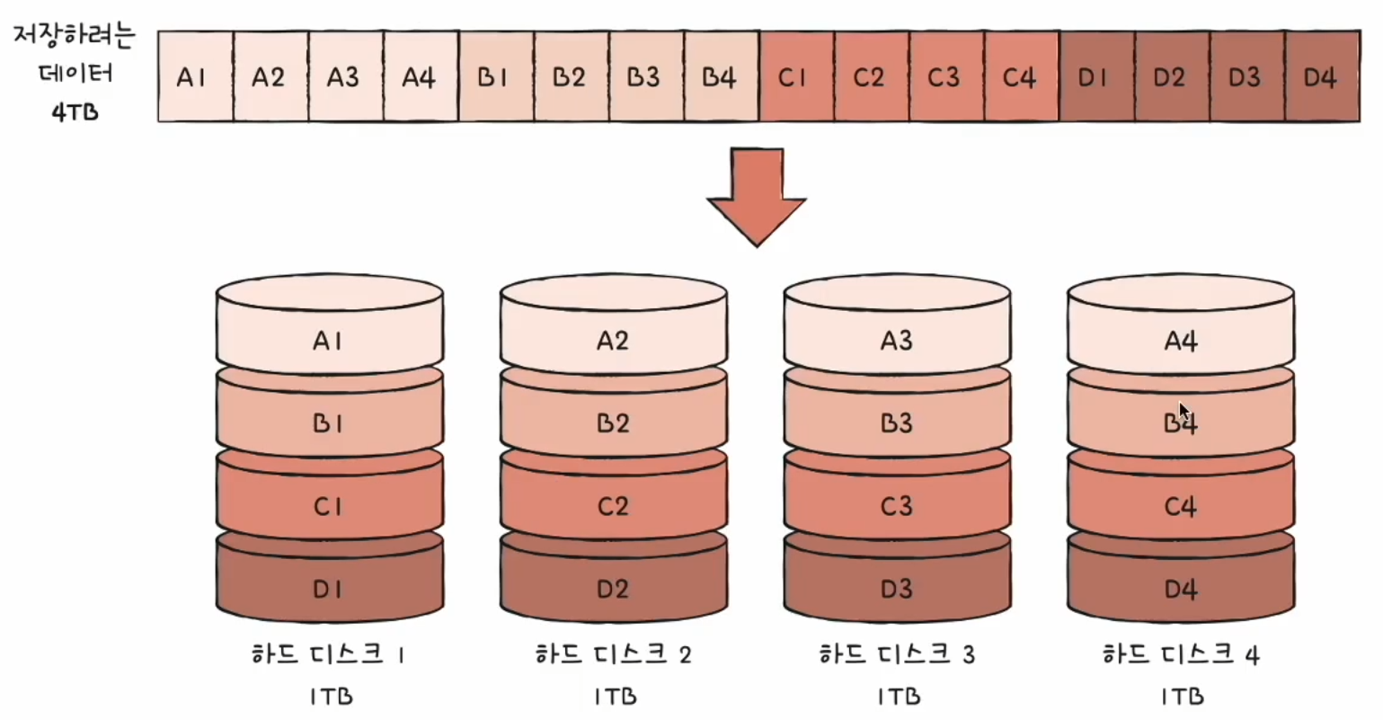 - 스트라이핑(striping) : 분산하여 저장하는 것