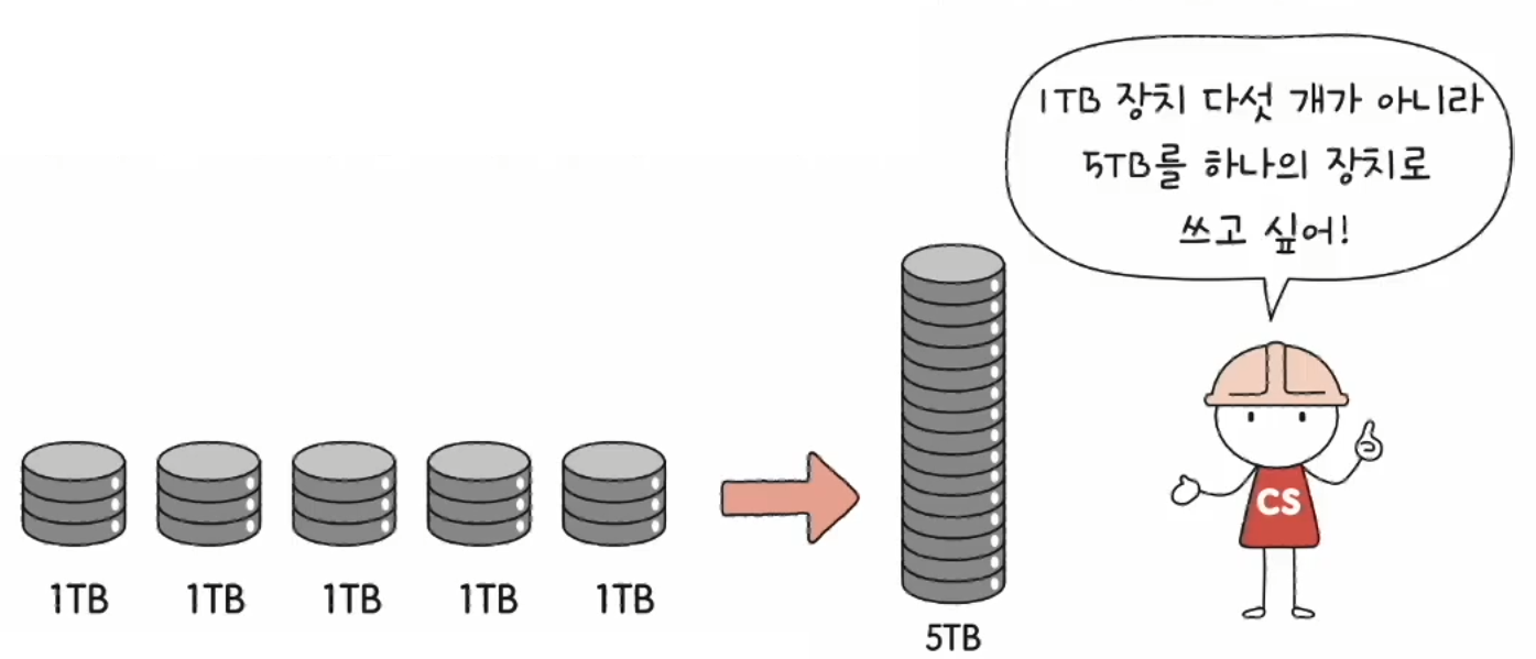 데이터의 안정성 혹은 높은 성능을 위해 여러 물리적 보조기억장치를 마치 하나의 논리적 보조기억장치처럼 사용하는 기수입니다.