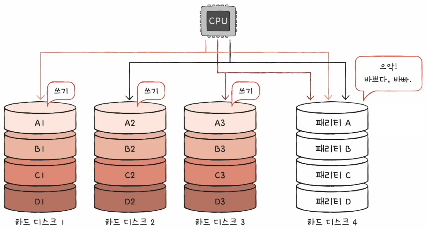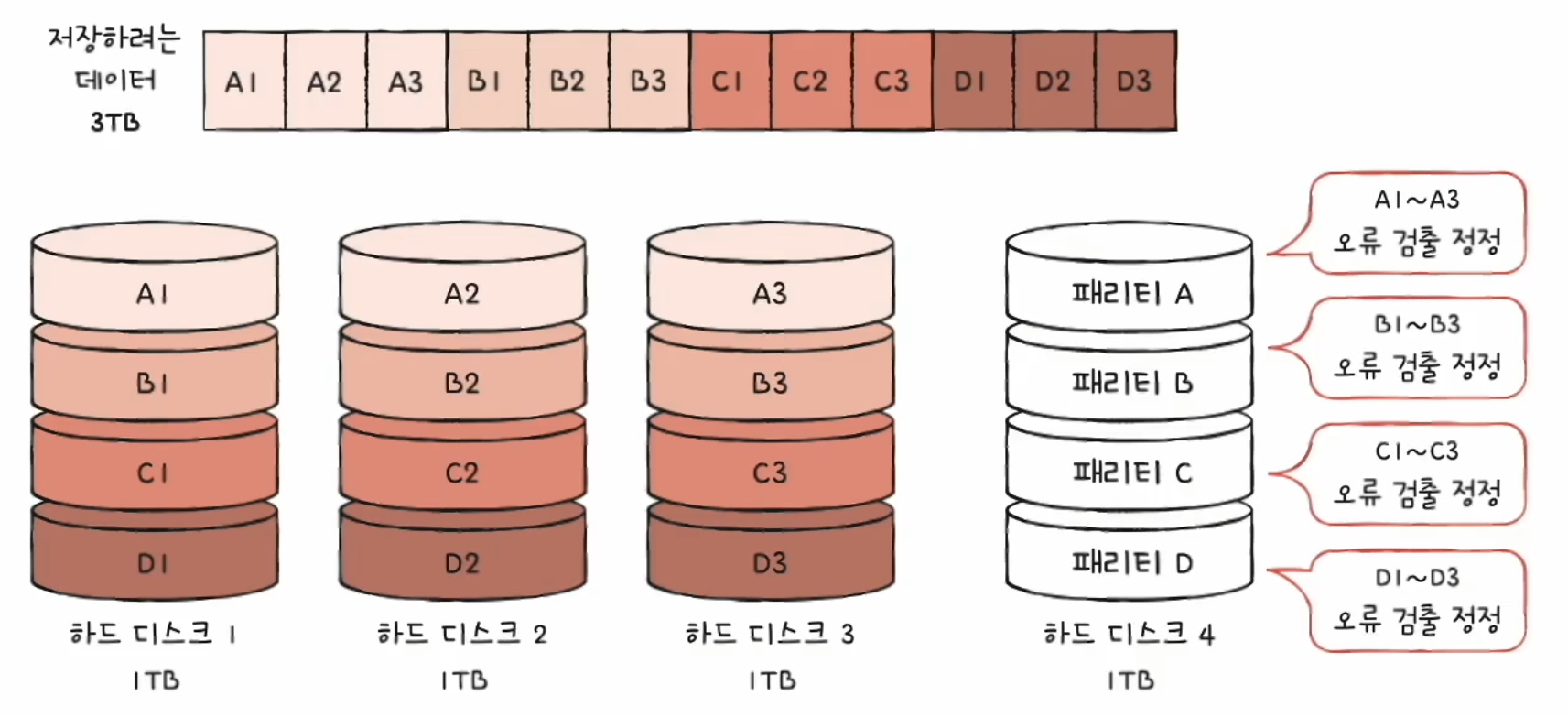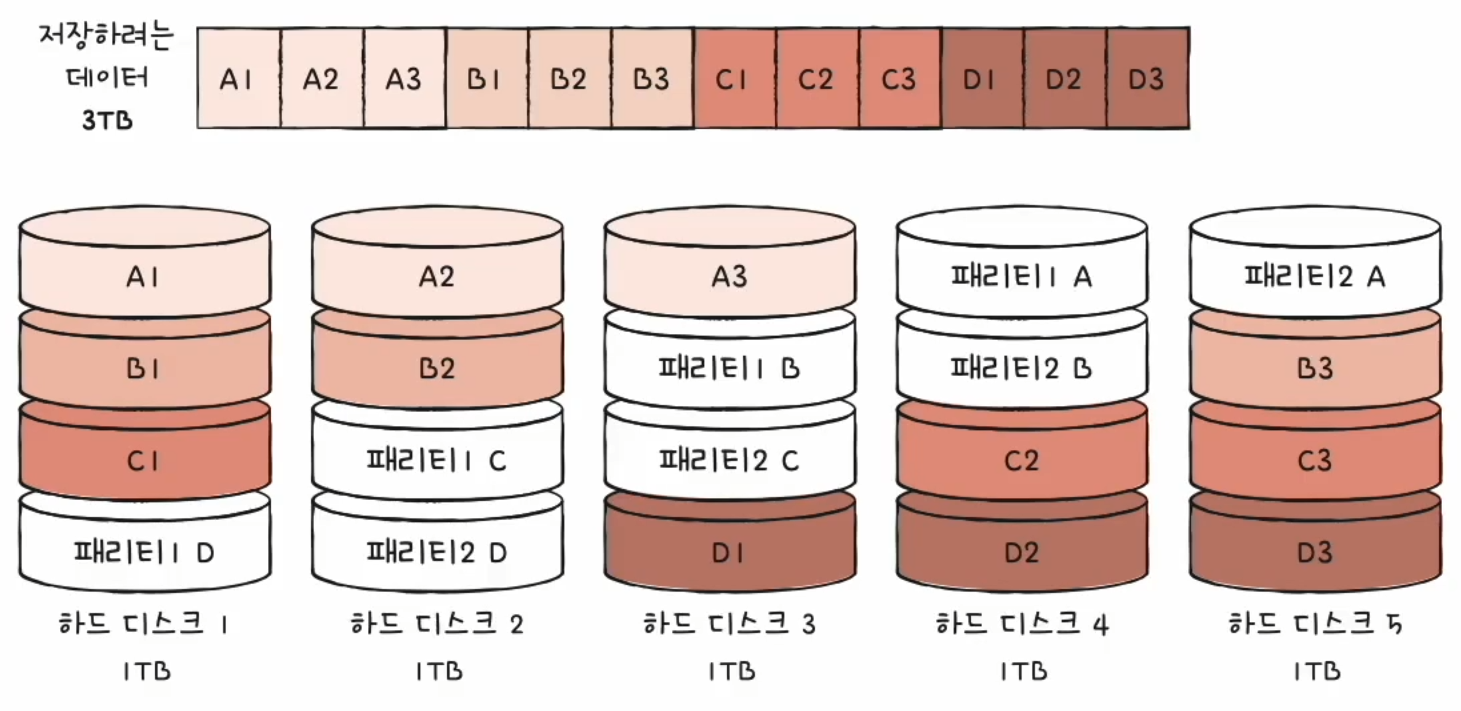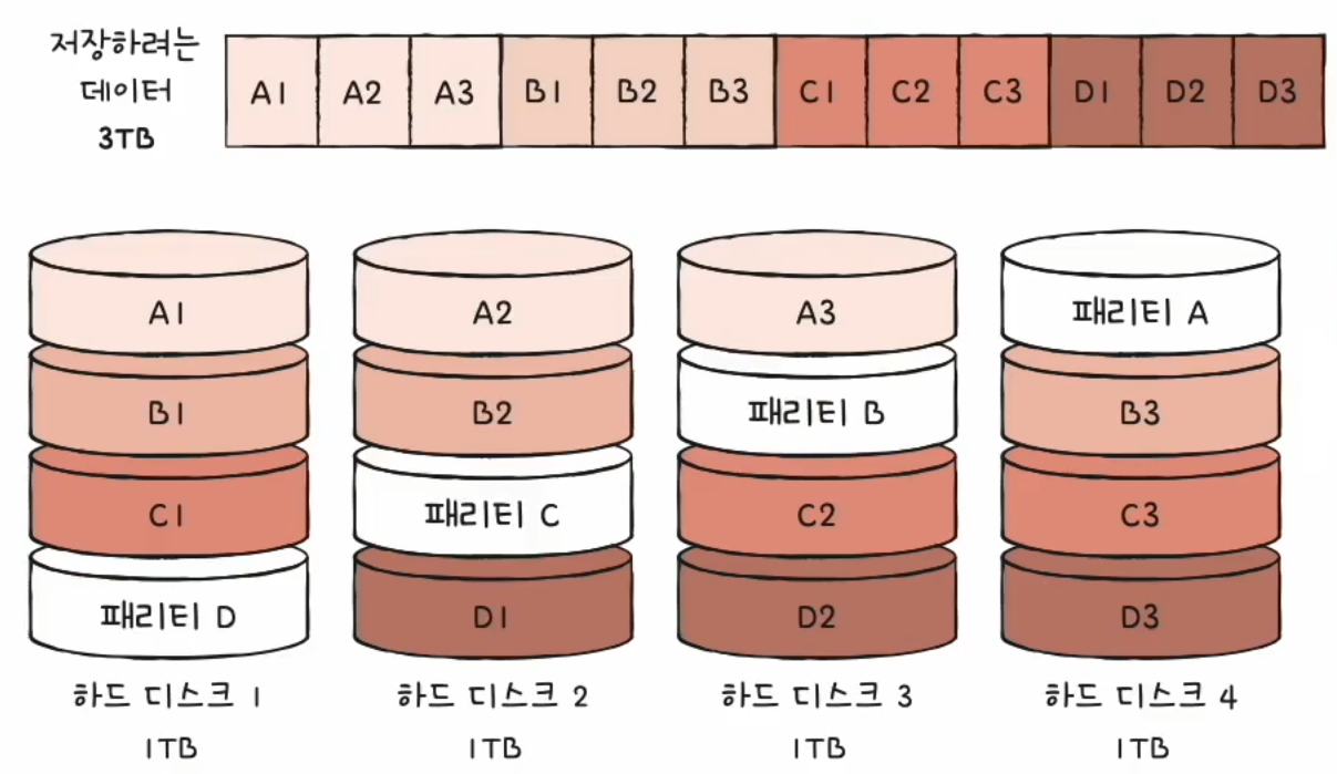 (RAID 0, RAID 1, RAID 2, ETC.)- 스트라잎(stripe) : 마치 줄무늬처럼 분산되어 저장된 데이터