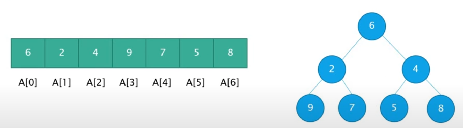 : 힙은 배열로 쉽게 표현할 수 있습니다. 배열 인덱스를 이용하여 부모와 자식 노드 간의 관계를 정의할 수 있습니다: