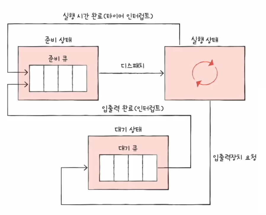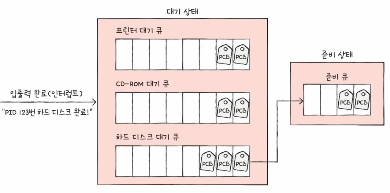 운영체제가 각 PCB를 일일이 확인하며 우선순위를 판단하기는 비효율적이기 때문에 여러 대기열을 만들어 프로세스를 관리합니다.