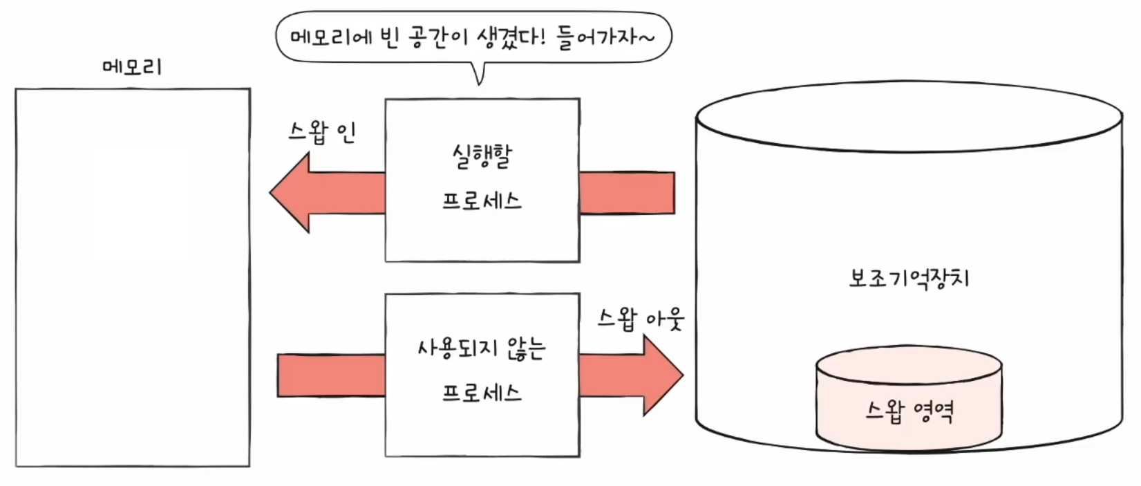 - 스왑 아웃(Swap Out) : 당장 사용되지 않는 프로세스를 보조기억 장치의 스왑 영역으로 이동시키는 과정