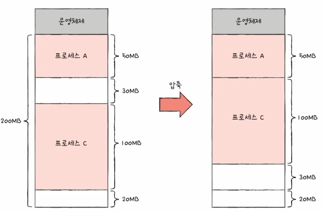 프로세스를 적당히 재배치시켜 흩어져 있는 작은 빈 공간들을 하나의 빈 공간으로 만드는 방법입니다.