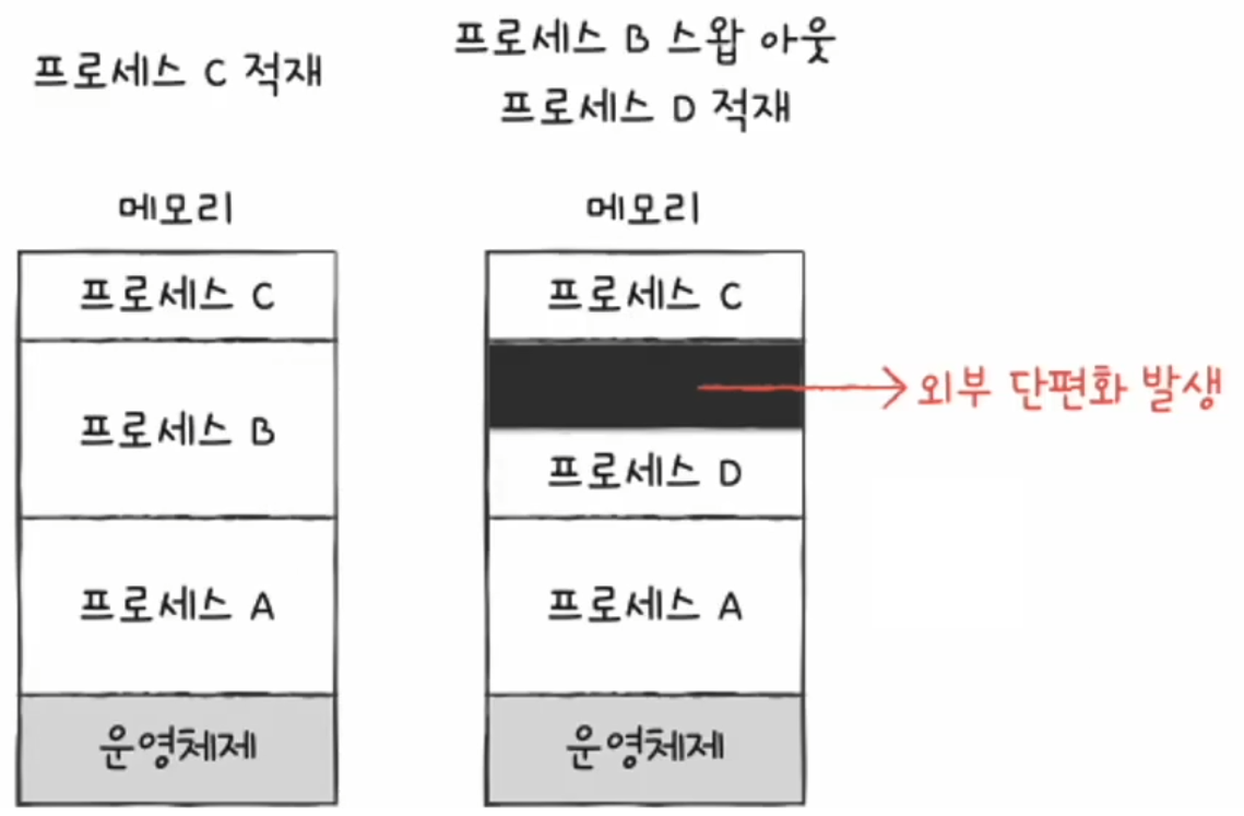 사실, 프로세스를 연속적으로 메모리에 할당하는 방식은 외부 단편화 (external fragmentation) 라는 문제가 발생하기 때문에 메모리를 효율적으로 사용하는 방법이 아닙니다.