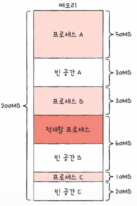 빈 공간이 여러 개 있을 시 최초 적합, 최적 적합, 최악 적합 3가지 방식으로 메모리 할당을 진행할 수 있습니다.