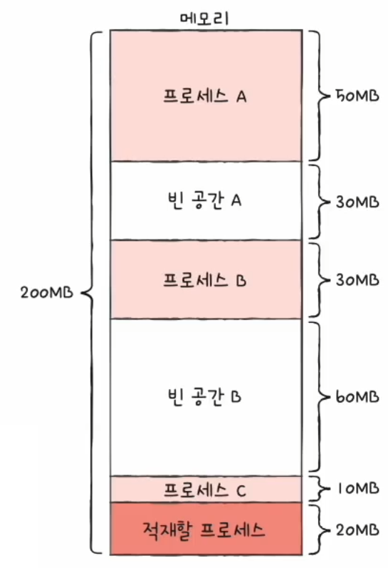 : 프로세스 A는 A의 크기만큼 메모리 할당,