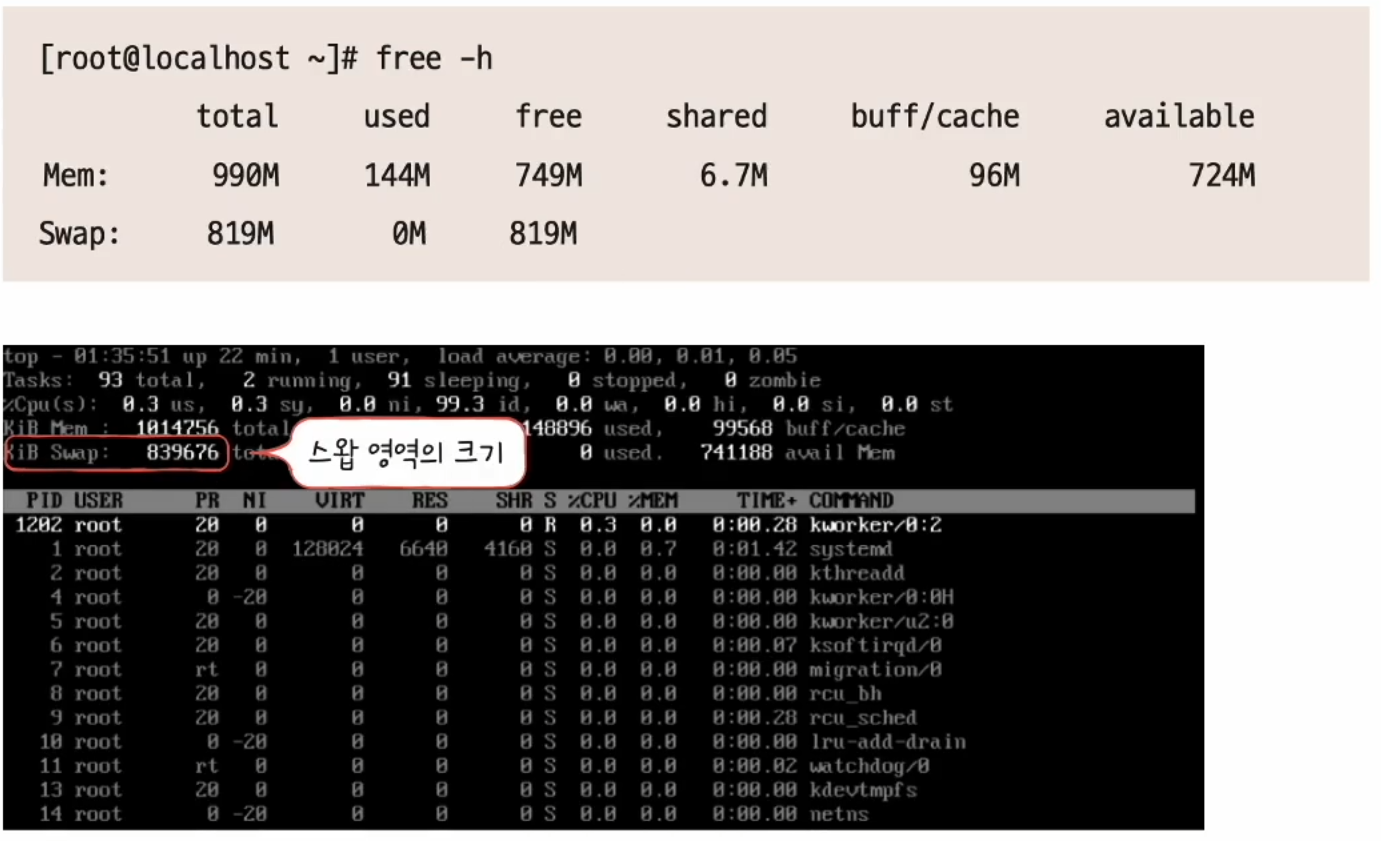 +. free, top 명령어를 통해 스왑 영역의 크기를 확인할 수 있습니다.