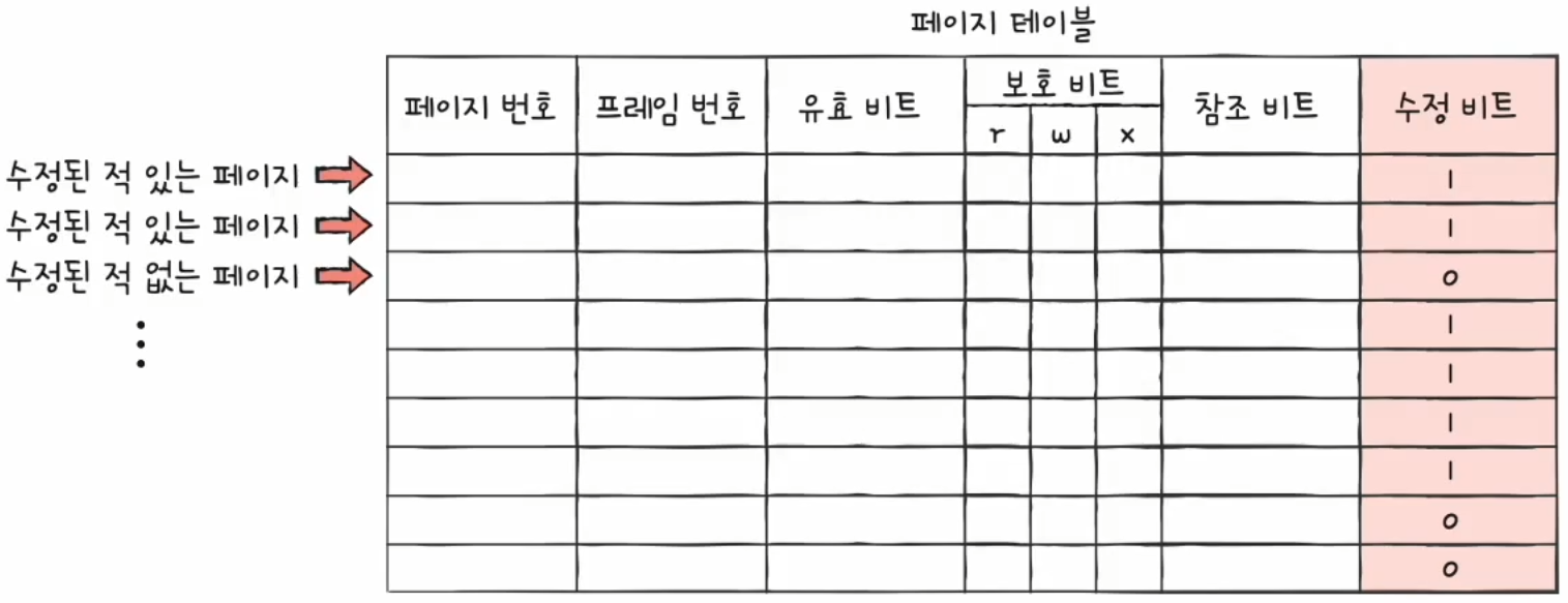 수정 비트 이미지 → 만약 페이지가 수정되었다면, 스왑 아웃될 때 보조기억장치에도 쓰기 작업을 거쳐야 하기 때문에 존재합니다.