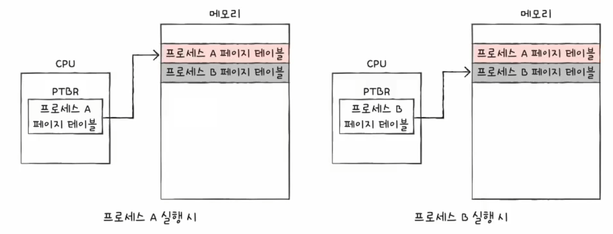 프로세스 테이블 베이스 레지스터(PTBR)는 각 프로세스 페이지 테이블이 적재되어 있는 주소를 가리킵니다.