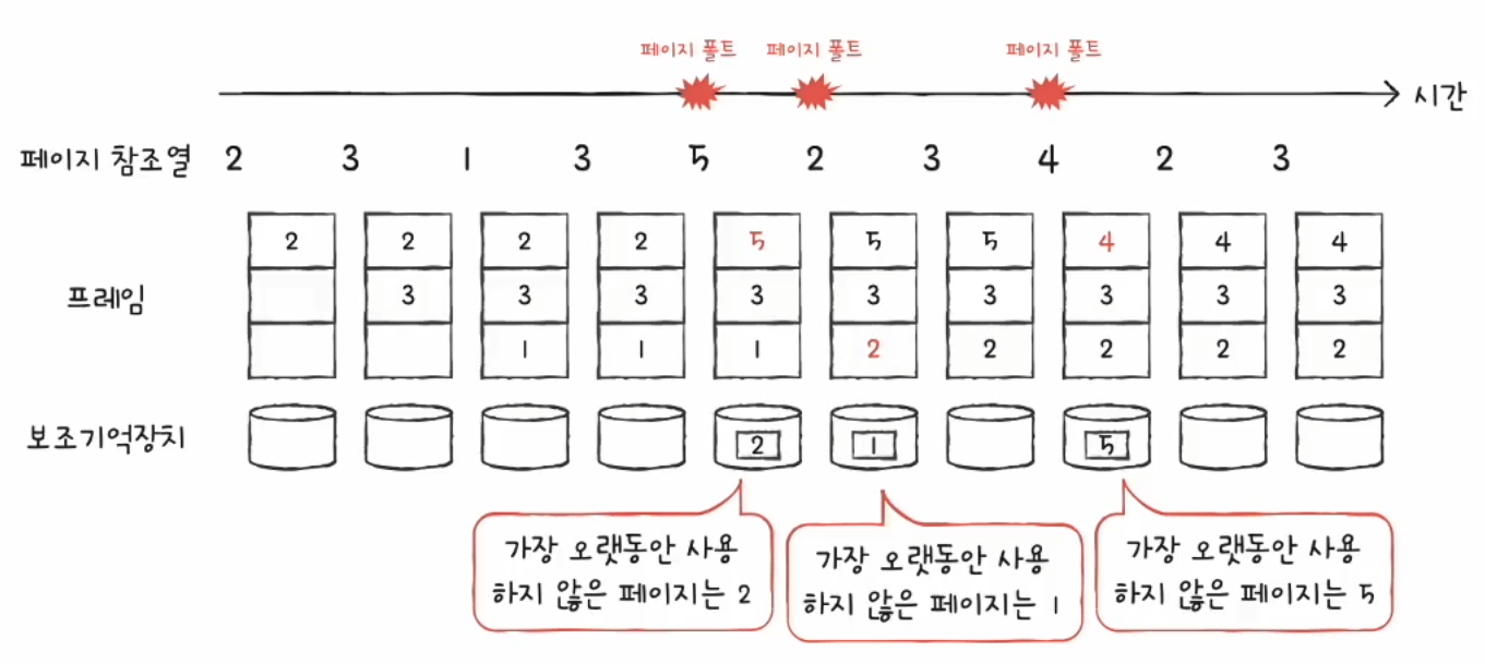 : 지금까지 사용 빈도가 가장 낮았던 페이지를 교체하는 알고리즘입니다.