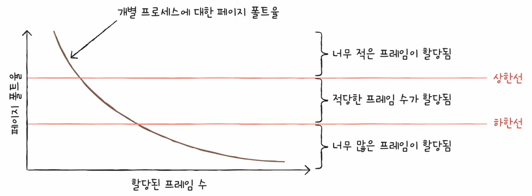 : 페이지 폴트율에 상한선과 하한선을 정하고, 그 내부 범위 안에선만 프레임을 할당하는 방식입니다.