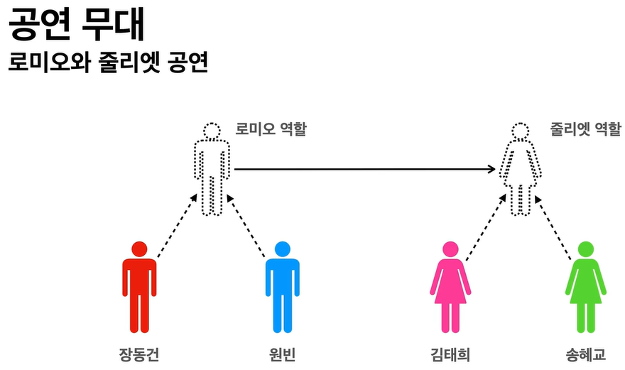 : 로미오와 줄리엣은 각각의 역할을 가진 극 중 인물이며, 다양한 배우가 이 역할을 수행할 수 있습니다. 만약 로미오가 클라이언트이고 줄리엣이 서버라고 가정한다면, 줄리엣 역할의 구현이 바뀌더라도 로미오 역할에는 영향을 미치지 않습니다.