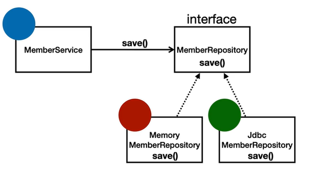 - "MemberRepository" 인터페이스는 다양한 구현체("MemoryMemberRepository"와 "JdbcMemberRepository")를 가질 수 있습니다.
