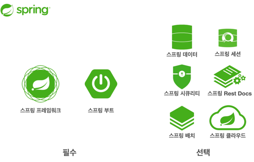 스프링은 다양한 기술의 모음으로 구성되어 있습니다. 핵심인 스프링(Spring) 프레임워크와 함께, 여러 스프링 기술을 편리하게 사용할 수 있도록 돕는 스프링 부트(Spring Boot)가 있습니다. 또한, 스프링 데이터, 스프링 세션, 스프링 시큐리티, 스프링 REST Docs, 스프링 배치, 스프링 클라우드 등 다양한 모듈이 함께 제공됩니다.