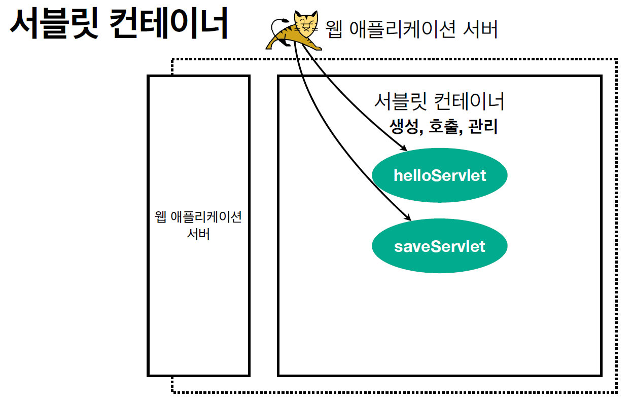 - 서블릿 컨테이너는 서블릿을 지원하는 WAS, 예를 들어 Tomcat과 같은 시스템을 의미하며, 서블릿 객체의 생성, 초기화, 호출, 종료 등의 생명주기를 관리합니다.