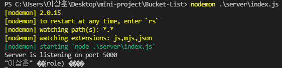 => 서버 실행 후 Postman에서 POST메소드를 실행하니 콘솔에 "이상훈" ��(role) ���� 이라는 오류메시지 출력되면서 서버의 response가 돌아오지 않는 문제 발생!